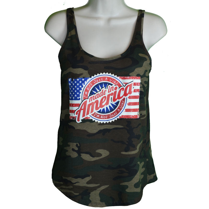 This tank top is as American as you can get! Show your patriotism everyday with this fatigue camo tank boasting a classic Made in America sticker over a faded Old Glory American flag. The tank has a very flattering a-line cut with a scalloped hem and slim tank top straps. Support our troops!