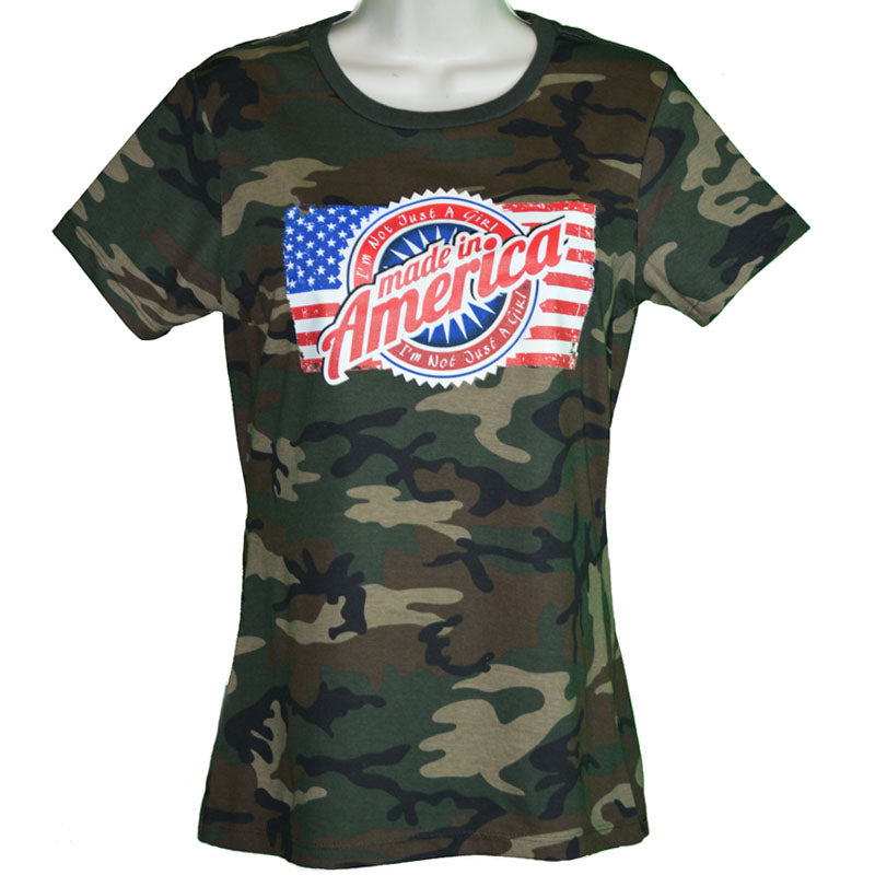 This ladies tshirt is as American as you can get! Show your patriotism everyday with this fatigue camo shirt boasting a classic Made in America sticker over a faded Old Glory American flag. The tshirt has a very flattering a-line cut. Support our troops!