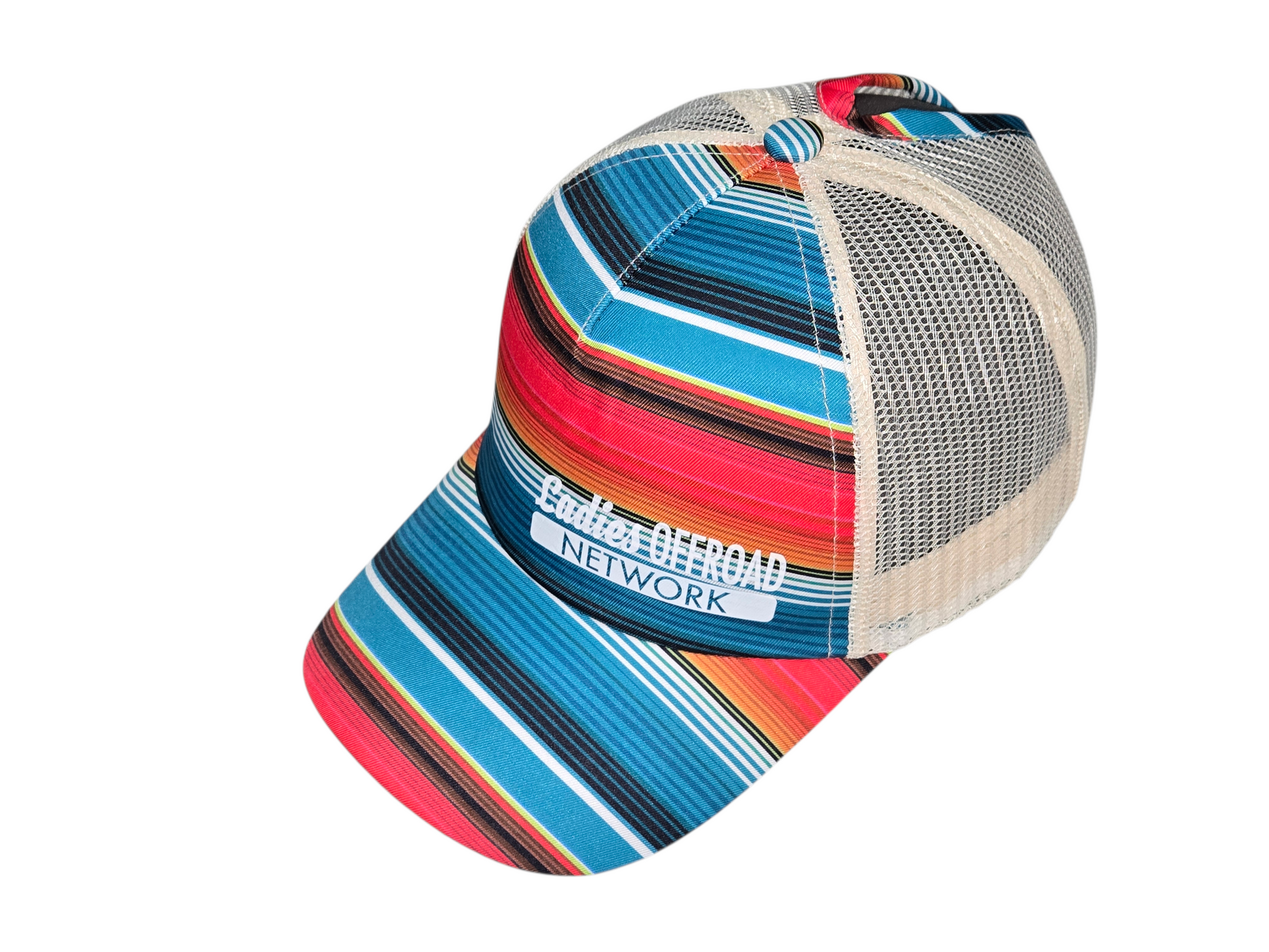 Stand out from the pack with this vibrant baja blanket pony tail hat that brings bold style to every trail ride. The eye-catching pattern paired with the crisp white Ladies Offroad Network logo creates a look that's unmistakably you. Built to keep your hair secure during intense off-road action, this hat lets you express your adventurous personality while staying comfortable and functional. Why settle for ordinary when you can rock something that truly represents your passion for the off-road community?